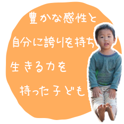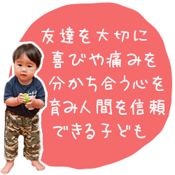 0歳の赤ちゃん、弱さや障がいを持った子ども、どの子も一人の人間として人格を尊び、個性や発達を把握しながら、丸ごと受け入れます。子どもの心に寄り添い、障がい児も健常児も共に仲間として育ち合い、優しさと生きる力を養います。産休明け保育・延長保育・障がい児保育、世代間交流を行います。父母の子育ての悩みや不安など、子育ての相談活動も行ってまいります。家族団欒を大切にし、子どもの表情に気遣い、話をよく聞きスキンシップを大切に、可愛がって育てましょう。子ども時代に、お父さんお母さんはじめ大勢の大人からの真の愛情は、生涯を通し様々な困難を乗り越え前向きに生きる源です。